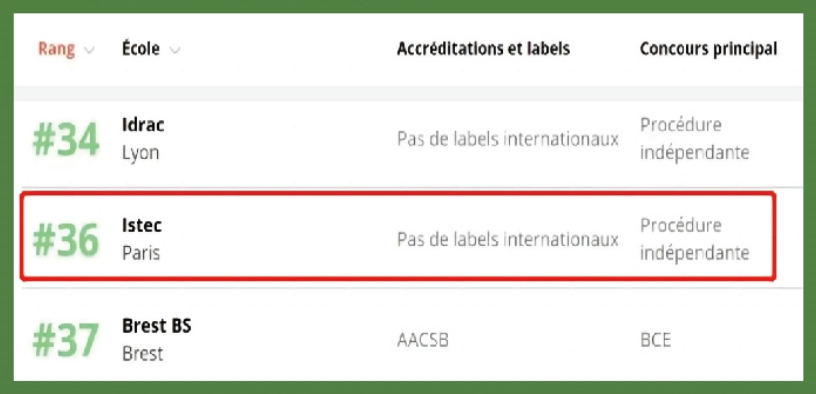 2018年全球Eduniversal排名中,ISTEC精英学院项目排第15名; 2022年《LE FIGARO》法国最佳商学院排名中,ISTEC排名全法第36位; 法国学生获得职业回报最大的高商中排名第3; 法国职业规划最佳的法国高商中排名第5。